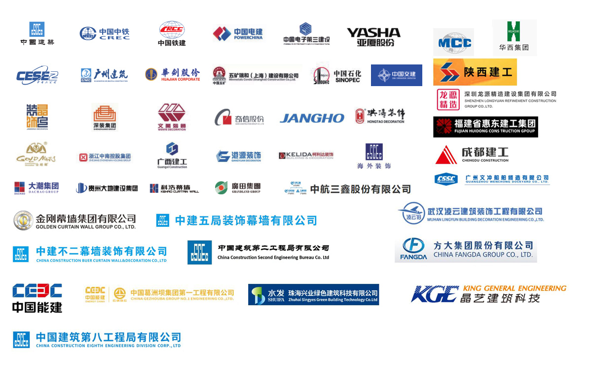 公司參建了諸多大型項目工程,如港珠澳大橋、珠海國際航展、深圳國際會展中心、廣州白云機場、西安全運會場館、成都東安湖大運會場館、樂山奧體中心、洛陽奧體中心、增城富士康廠房、惠州中海油、陽江核電站、珠三角各地鐵線、高鐵站、廣西桂林機場、廣西柳州文化廣場、四川成都天府機場、海南海口美蘭機場、西安絲路會展中心、惠州北站等等。與中國建筑、中國中鐵、中國鐵建、中國電建、中國交建、中國中冶、中國能建、廣東建筑、廣西建工、廣州建筑等大型國有企業下屬公司及江河幕墻、金螳螂裝飾等各大建筑裝飾、幕墻裝飾公司達成長期友好合作關系。